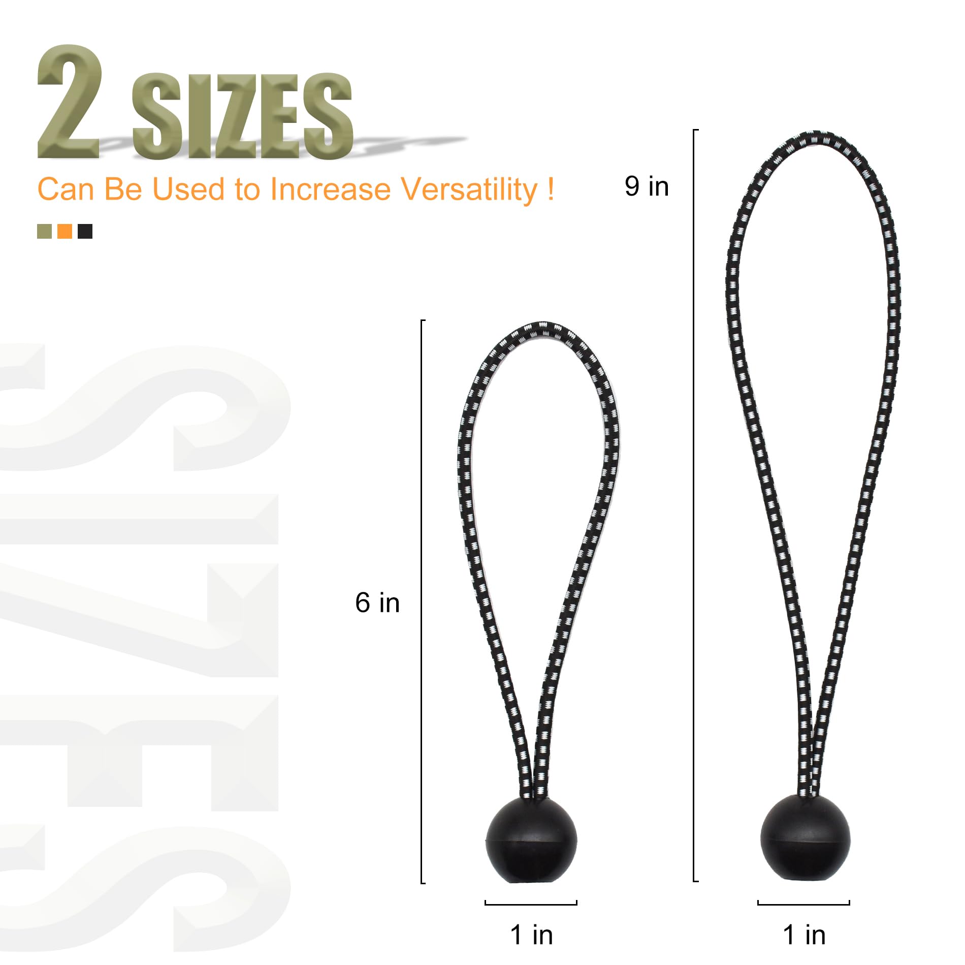 - 【Package Includes】: 30 pcs Bungee Balls .Elastic rope length of 6 ,9,11inches (including the ball), nylon ball diameter of 1 inch, stretched to twice as long, can be combined with multiple elastic rope for greater length and functionality;