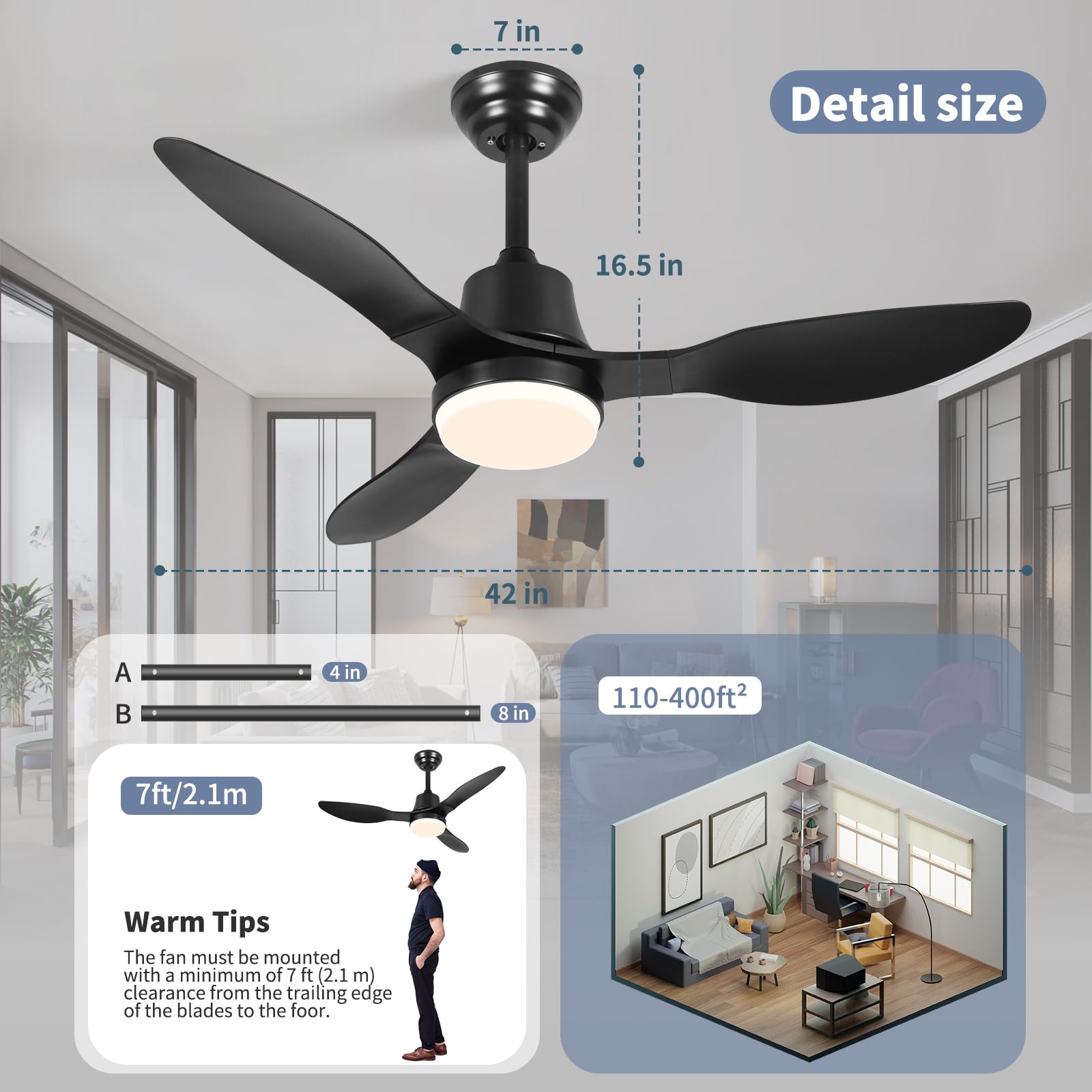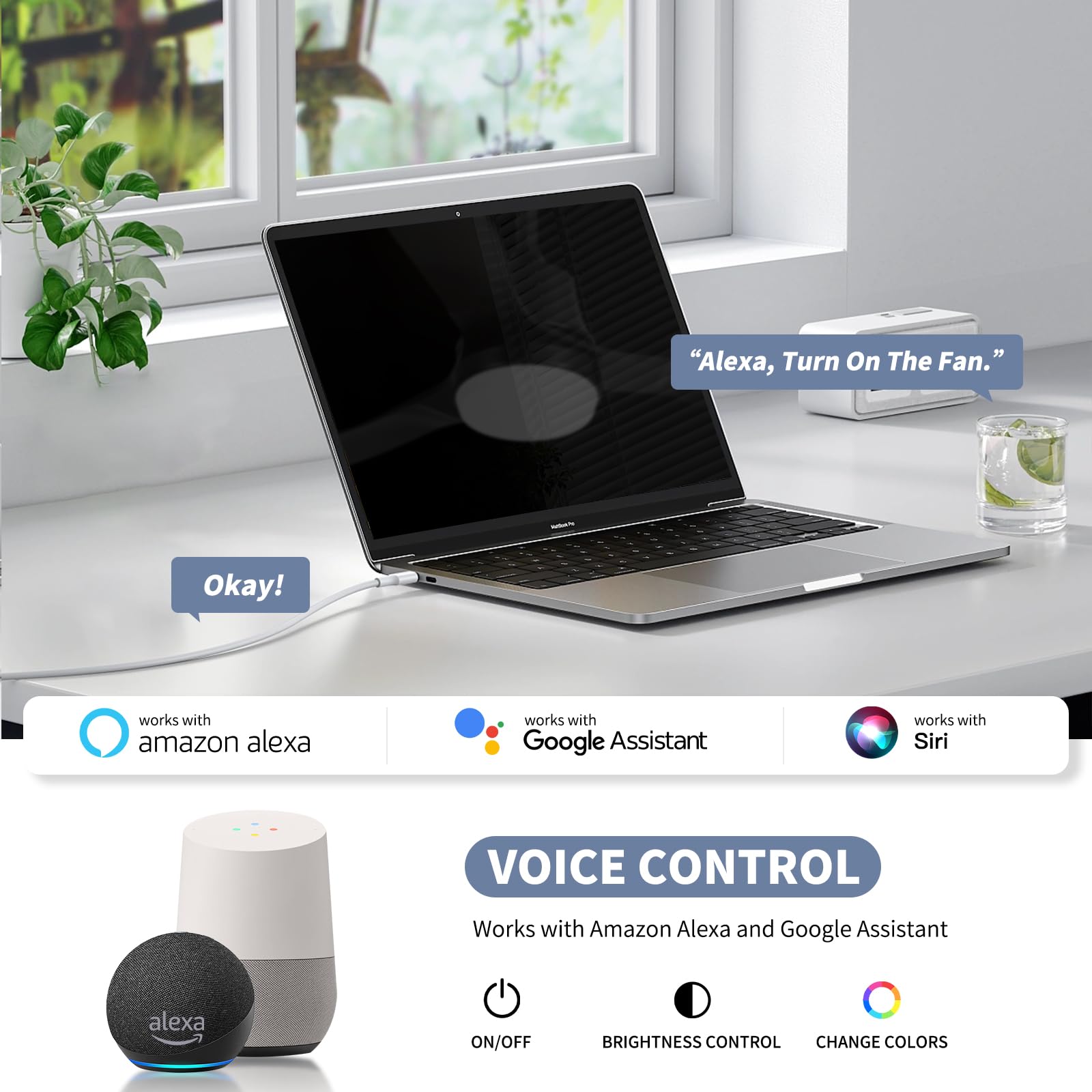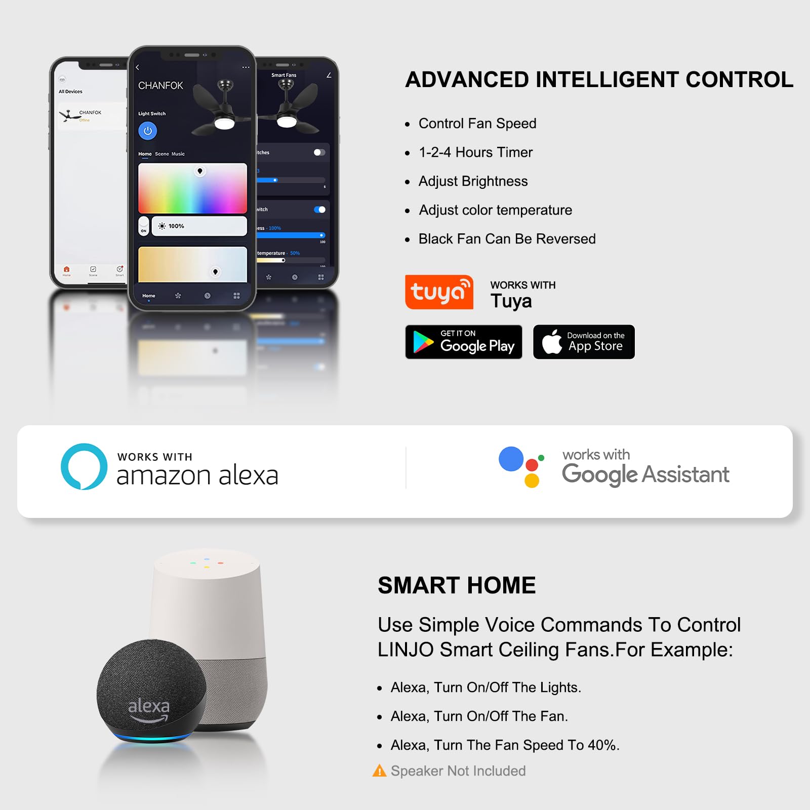 - 【Voice Control with Alexa and Google Assistant】: Add the alexa ceiling fan with light in the Alexa smart app and connect (in a 2.4Ghz network environment), You can activate the black smart ceiling fan with light by a simple conversation with voice, such as Alexa, turn on/off the 42 inch ceiling fan light, dim/brighten the light by 80%, set the light to warm white, etc.