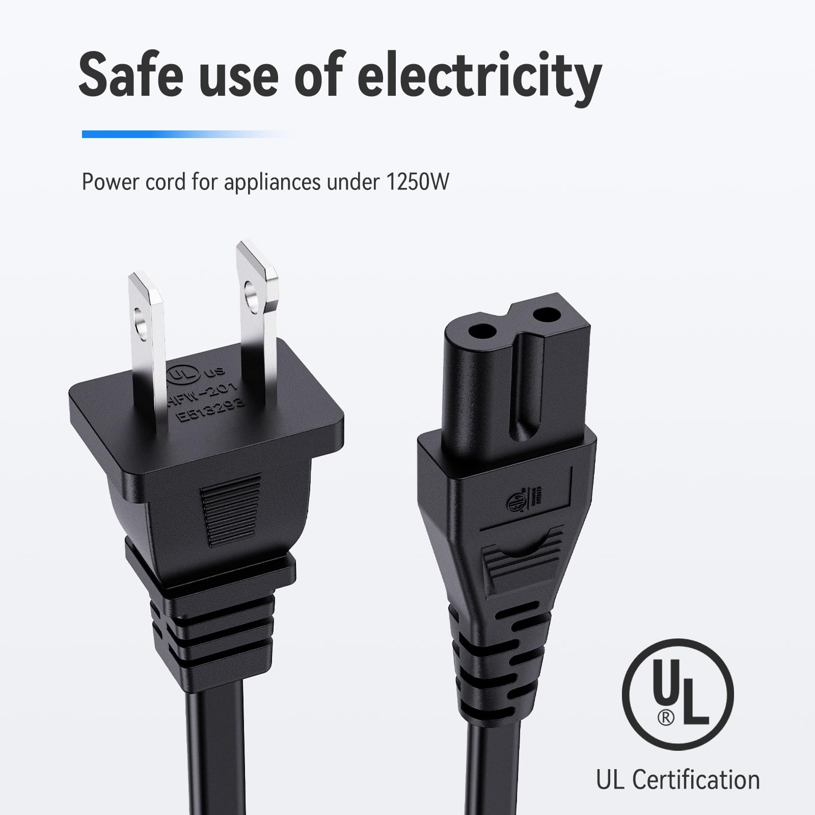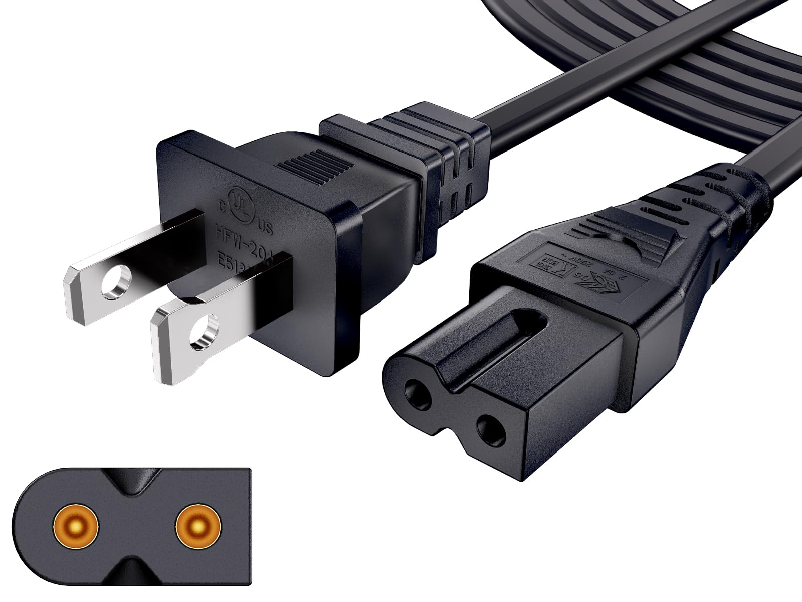 - Power Cord Type: 2-Prong Polarized, 18 AWG x 2C, 125V-10A Max. Length: 6 Feet