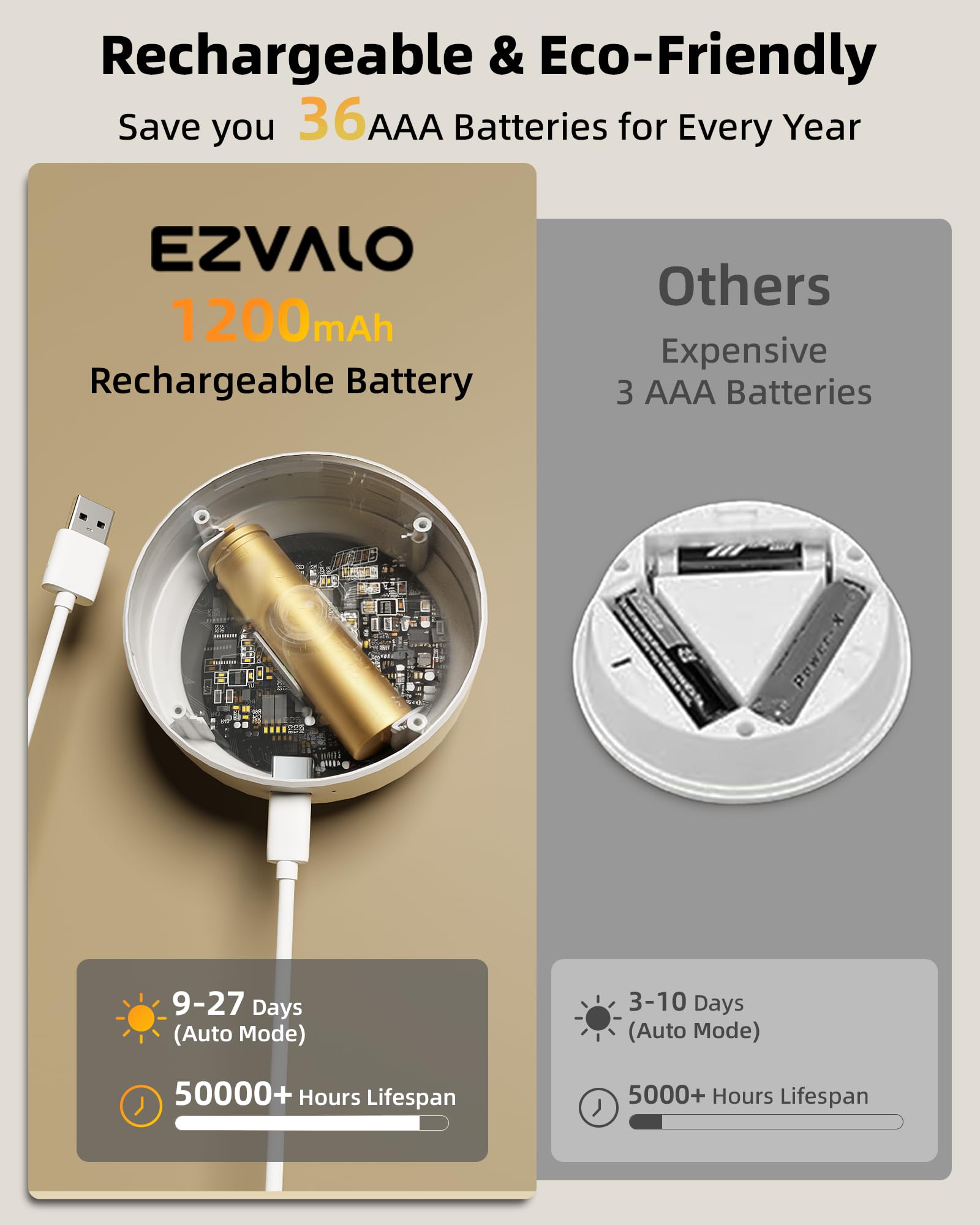 - USB-C Rechargeable Design: Environmentally friendly and cost-effective, no need to purchase AAA batteries. Our rechargeable motion lights built-in 1200mAh battery, When fully charged, they provide 9-27 days of illumination in [All-Day Motion Mode] and [Night Motion Mode] (depending on usage frequency) or 7.5 hours of continuous lighting in Always On Mode.
