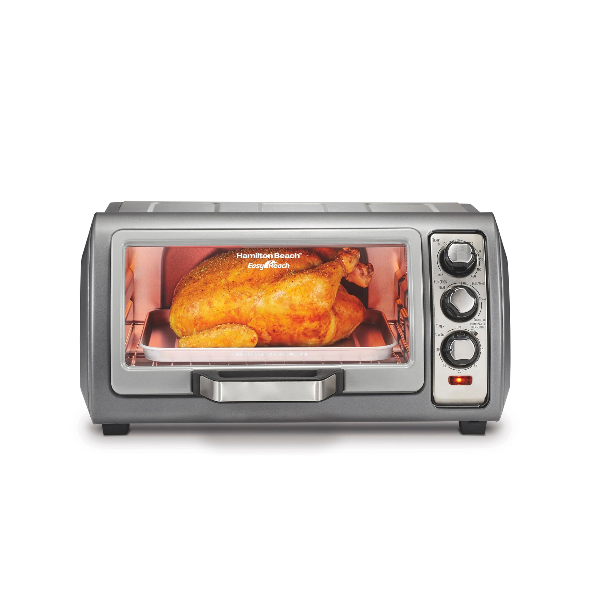 You won't find a design Like the Hamilton Beach 6 slice easy reach toaster oven with Roll-Top Door anywhere else. Its unique and large opening make food easy to reach. And since the door opens above the oven, It frees up your countertop space in front. Best of all, it's easy to keep clean Because food can't spill on the door.