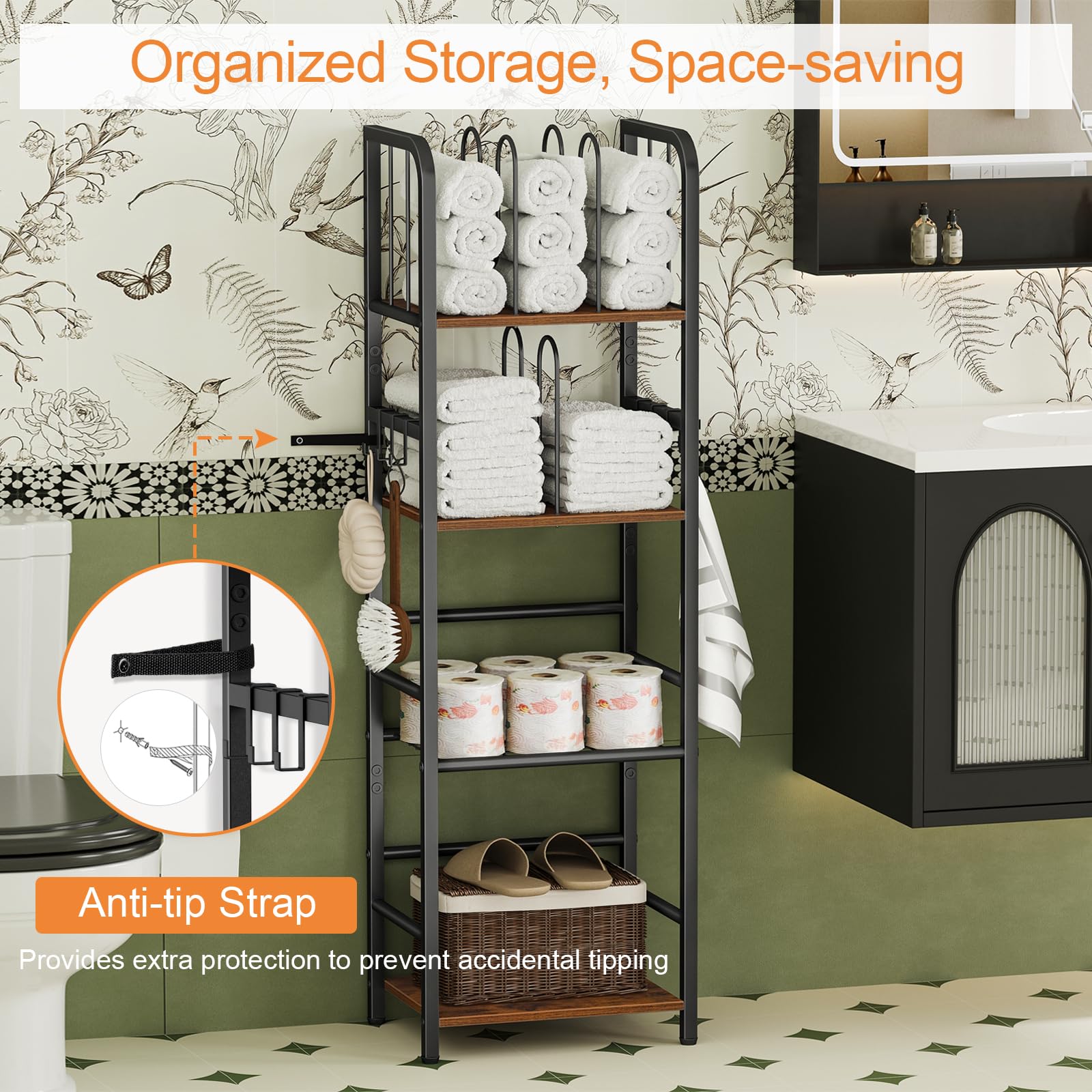- 【Spacious 3-Tier Shelving】: This towel rack features four spacious shelves, providing ample storage space for your bathroom essentials. The top two levels are ideal for storing towels and bath towels, while the bottom shelf can hold various toiletries and skincare products. The bathroom storage towel rack allows you to keep everything organized, making your bathroom tidy and easy to maintain.