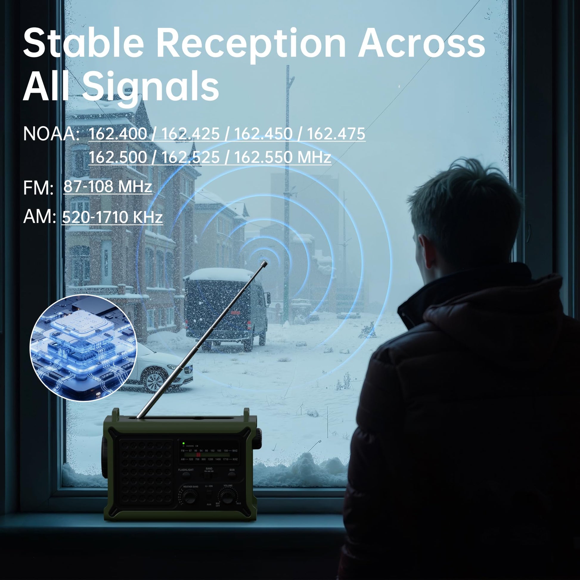 - ใReliable ๐ก๐ข๐๐/๐๐ /๐๐ Reception with Clear SoundใWith a high-sensitivity signal chip, noise-reduction circuitry, and an extended antenna, the radio ensures ๐ณ๐ฎ๐๐, ๐๐๐ฎ๐ฏ๐น๐ฒ ๐ฟ๐ฒ๐ฐ๐ฒ๐ฝ๐๐ถ๐ผ๐ป across NOAA FM AM bands. Whether you're sheltering during a storm or camping off the grid, you'll hear every update loud and clear.